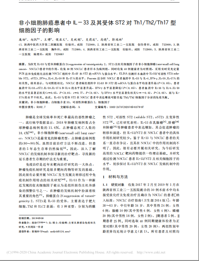 文獻(xiàn)題目 :非小細(xì)胞肺癌患者中IL-33及其受體ST2對(duì)Th1/Th2/Th17型細(xì)胞因子的影響